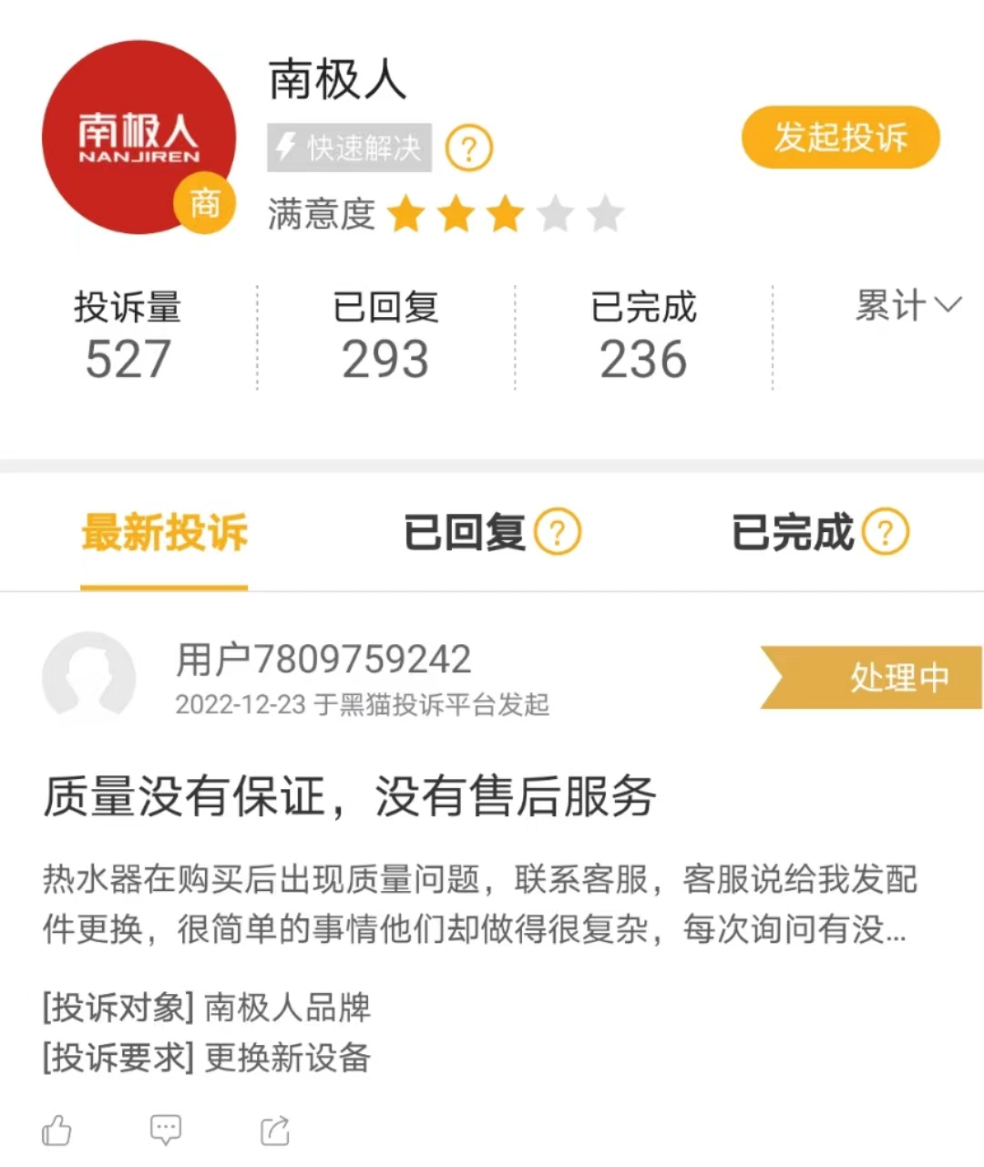 截至目前,黑貓投訴上關(guān)于南極人的投訴量達(dá)到527條,其中“質(zhì)量有問(wèn)題”是消費(fèi)者的一大投訴內(nèi)容。