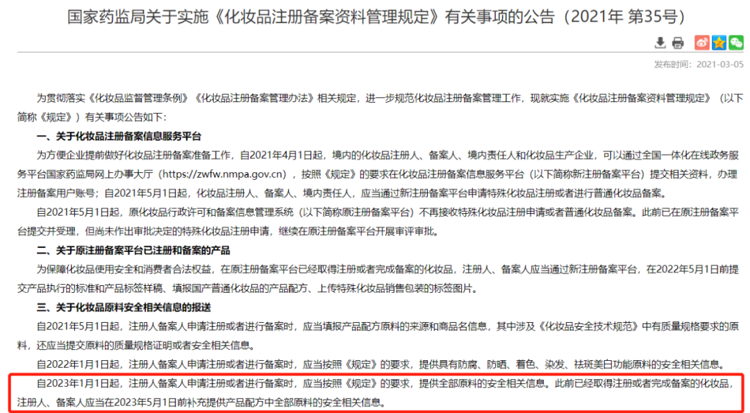 根據(jù)《國家藥監(jiān)局關(guān)于實(shí)施<化妝品注冊(cè)備案資料管理規(guī)定>有關(guān)事項(xiàng)的公告》,自2023年1月1日起,注冊(cè)人備案人進(jìn)行化妝品注冊(cè)備案時(shí),需提供全部原料的安全相關(guān)信息。此前已注冊(cè)備案的化妝品,應(yīng)在2023年5月1日前補(bǔ)充提供產(chǎn)品配方中全部原料的安全相關(guān)信息。