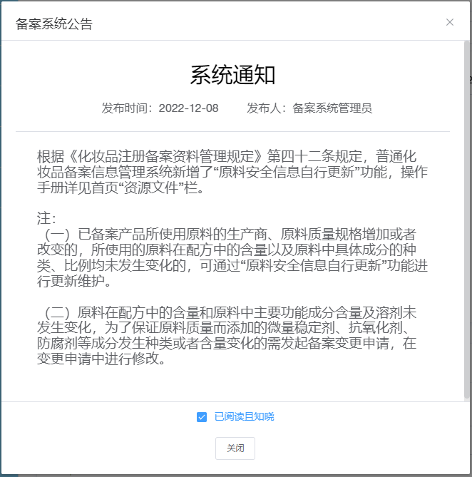 而就在不久前(12月7日),化妝品備案信息管理系統(tǒng)新增了“原料安全信息自行更新”功能,企業(yè)已備案產(chǎn)品所使用原料的生產(chǎn)商及原料質(zhì)量規(guī)格增加或改變時(shí),可自行更新,同時(shí),還可補(bǔ)錄原料安全相關(guān)信息,而不用再申請(qǐng)備案變更。