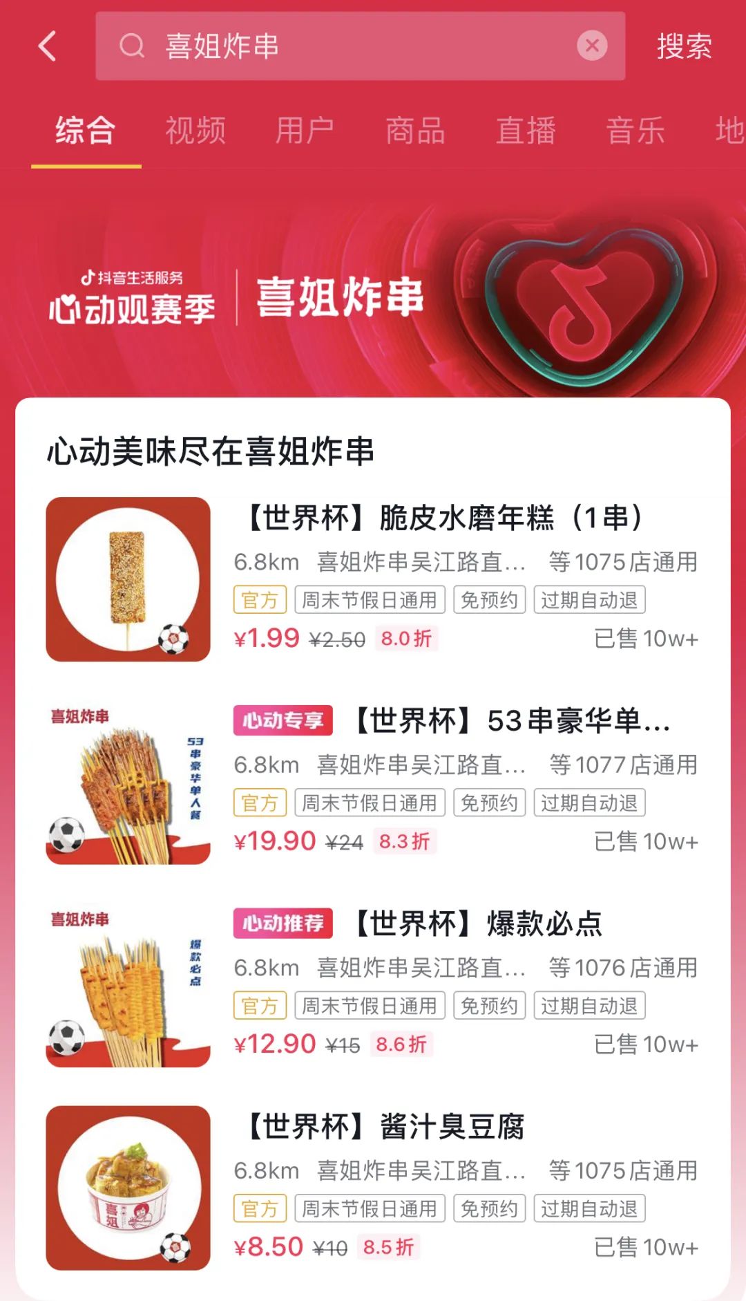 乘著抖音本地生活蒸蒸日上的東風,喜姐炸串僅投入了50萬的預算,就撬動了超1000萬GMV。