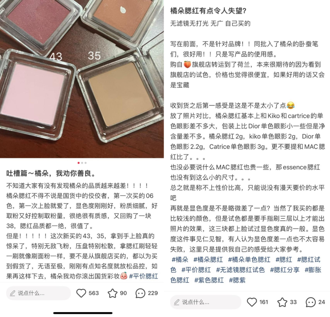 「子彈財觀」注意到,小紅書的用戶對橘朵的吐槽也不鮮見,主要包括顯色度差、持久度差、腮紅飛粉等問題。