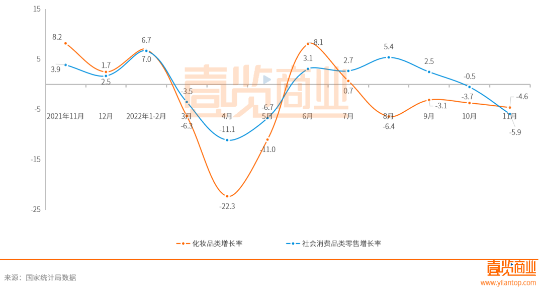 據(jù)國(guó)家統(tǒng)計(jì)局?jǐn)?shù)據(jù)顯示,2022年1-11月份,社會(huì)消費(fèi)品零售總額399190億元,同比下降0.1%,而化妝品行業(yè)同比下降了3.1%。