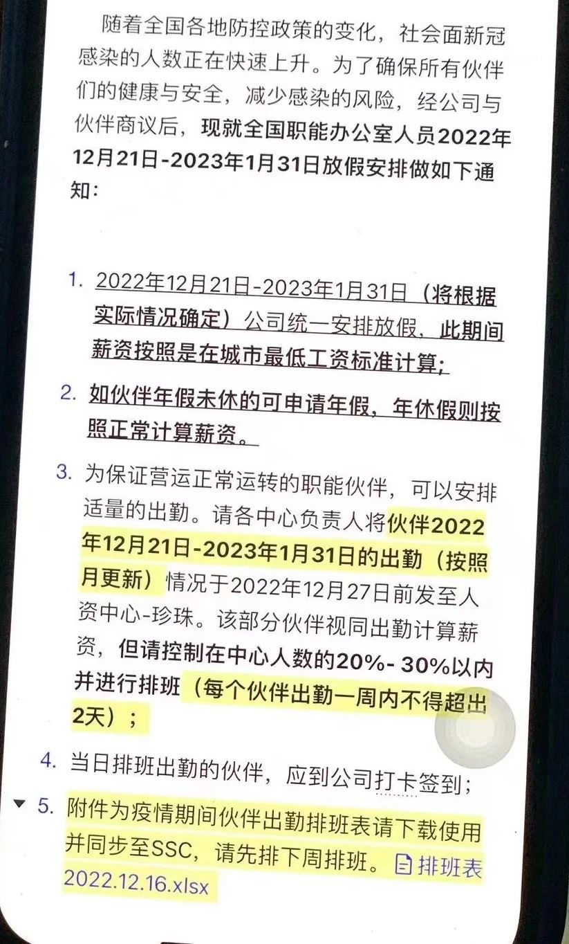為應(yīng)對(duì)十月十一月疫情極端管控影響,暫時(shí)性調(diào)整了部分非一線員工工資,占比較。谎b修供應(yīng)商因施工爭(zhēng)議,正在協(xié)商尾款,將積極與供應(yīng)商溝通;因陽(yáng)性員工暴增,臨時(shí)關(guān)閉部分辦公室,員工可遠(yuǎn)程工作,公司經(jīng)營(yíng)正常,隨著員工康復(fù),短期內(nèi)將回復(fù)常態(tài)。