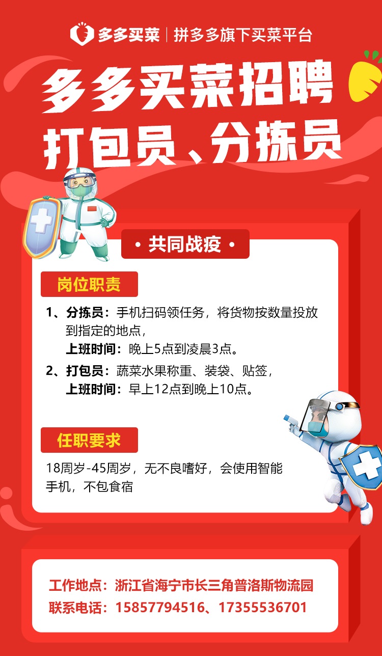 同時(shí),多多買菜發(fā)布了招聘海報(bào),其中特別提到了分揀員、打包員、司機(jī)等崗位。比如分揀員,需要手機(jī)掃碼領(lǐng)任務(wù),將貨物按數(shù)量投放到指定的地點(diǎn);打包員主要負(fù)責(zé)給蔬菜水果稱重、裝袋、貼簽。海報(bào)上有具體的聯(lián)系方式,有意向的市民可以直接聯(lián)系。在這個(gè)特殊時(shí)期,為千家萬戶送去一份溫暖。