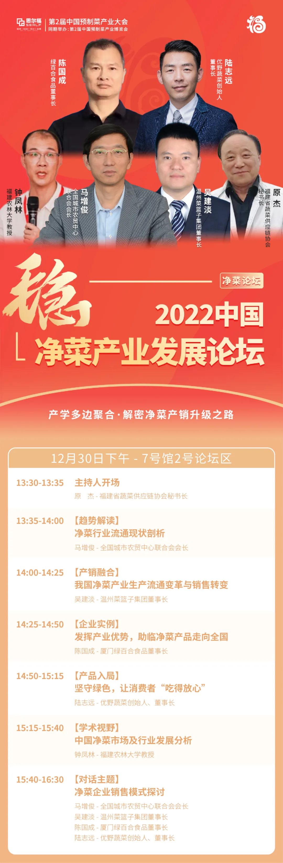 本次論壇我們邀請到了:1、“全國城市農(nóng)貿(mào)中心聯(lián)合會會長、世界批發(fā)市場聯(lián)合會主席”馬增。2、“承擔著溫州市“菜籃子”工程相關(guān)民生服務(wù),蔬菜年成交量近5億公斤”溫州菜籃子集團董事長吳建淡;3、“廈門市蔬菜貿(mào)易及加工龍頭企業(yè)”綠百合食品董事長陳國成;4、“福建省首家包裝蔬菜品牌公司,成為包括山姆、沃爾瑪、大潤發(fā)等超過600家商超門店和蔬菜核心供應(yīng)商”的優(yōu)野蔬菜創(chuàng)始人、董事長陸志遠;5、“農(nóng)業(yè)農(nóng)村部蔬菜生產(chǎn)全程機械化專家指導組成員、福建農(nóng)林大學教授”鐘鳳林;6、“福建蔬菜供應(yīng)權(quán)威協(xié)會”福建省蔬菜供應(yīng)鏈協(xié)會秘書長原杰。