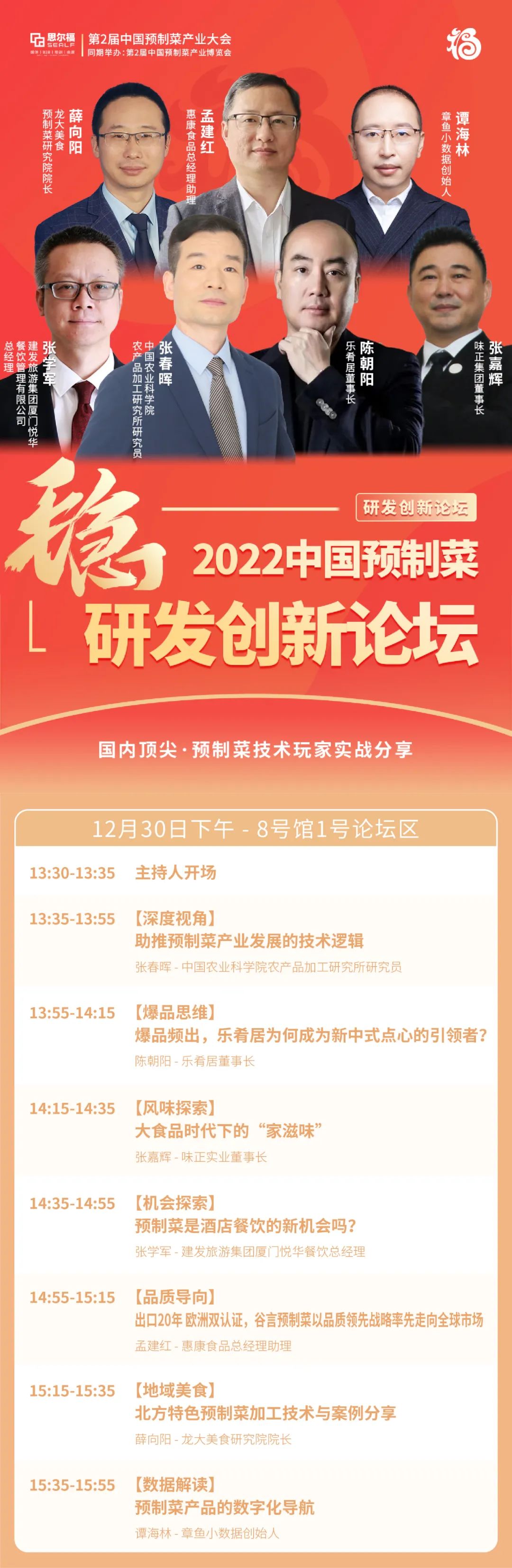 本次論壇我們邀請到了:1、中國農(nóng)業(yè)科學院農(nóng)產(chǎn)品加工研究所研究員、“中式食品加工與裝備”創(chuàng)新團隊首席科學家,國家“萬人計劃”科技領(lǐng)軍人才張春暉;2、“斬獲近億元B輪融資,助力1000家餐飲品牌產(chǎn)品升級”的樂肴居董事長陳朝陽;3、“39年老字號,服務(wù)經(jīng)銷商600+家,擁有230+個自渠網(wǎng)點”的味正集團董事長張嘉輝;4、“世界五百強企業(yè)建發(fā)集團的全資子公司”的建發(fā)旅游集團廈門悅?cè)A餐飲管理有限公司總經(jīng)理張學軍;5、“日產(chǎn)谷言產(chǎn)品50萬份,年產(chǎn)值達40億,產(chǎn)品暢銷國內(nèi)外”的惠康食品總經(jīng)理助理孟建紅;6、“深耕食品行業(yè)26年,營收近200億”的龍大美食預(yù)制菜研究院院長薛向陽;7、“深度服務(wù)圣農(nóng)、和府撈面、絕味等50余家頭部企業(yè)”的章魚小數(shù)據(jù)創(chuàng)始人譚海林。