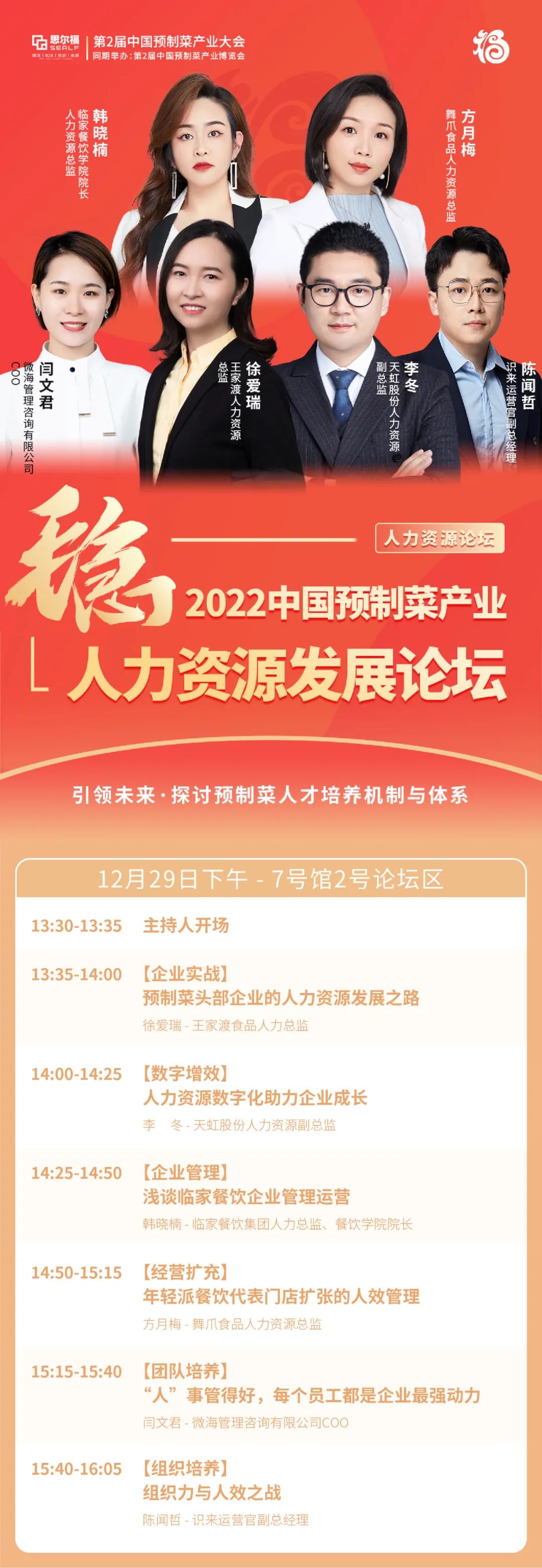 本次論壇我們邀請到了:1、“眉州東坡集團旗下,專業(yè)從事川味食品研發(fā)、生產(chǎn)和銷售”的王家渡食品人力總監(jiān)徐愛瑞;2、“中國連鎖百強國有控股企業(yè),總營業(yè)面積436萬㎡“天虹股份的人力資源副總監(jiān)李冬;3、“經(jīng)營面積超 40000 平方米,直營門店19 家”臨家餐飲集團人力總監(jiān)韓曉楠;4、“逐漸成為雞爪品類冠軍及世界鹵味年輕派代表”的舞爪食品人力資源總監(jiān)方月梅;5、“由原來海底撈人事部、財務(wù)部孵化而來,專注于連鎖服務(wù)業(yè)的人力資源及財稅管理綜合服務(wù)”微海管理咨詢有限公司COO閆文君;6、“通過SAAS工具,成為餐飲企業(yè)自動化培訓官”識來運營官副總經(jīng)理陳聞?wù)堋?