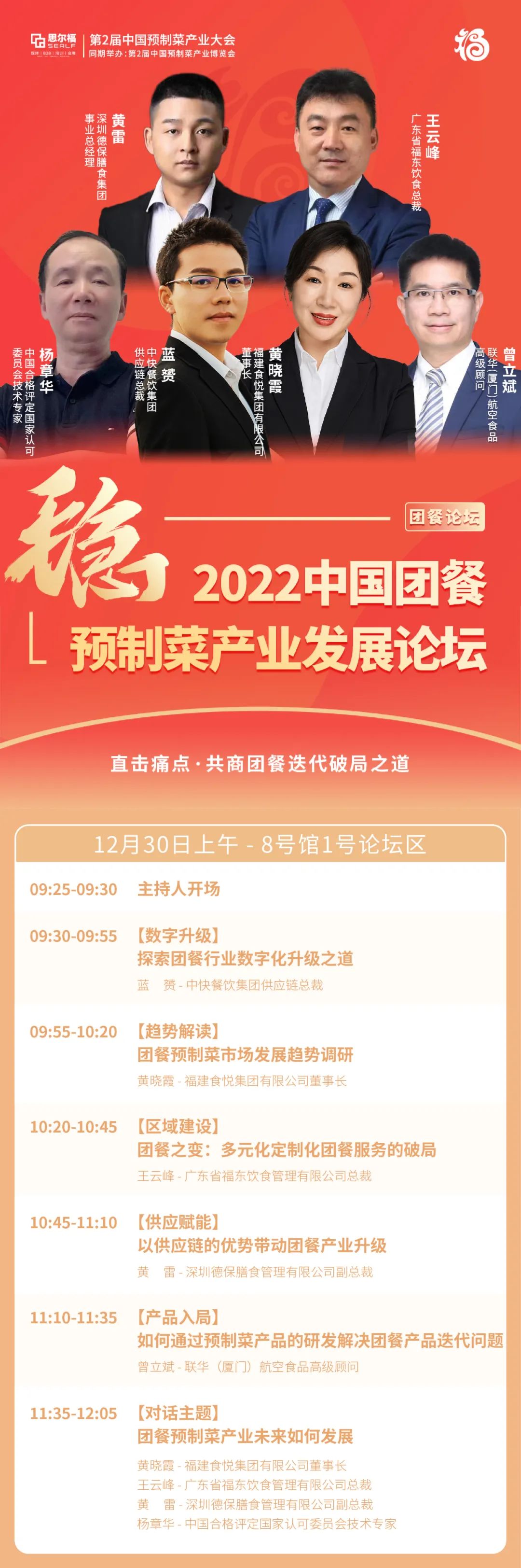 本次論壇我們邀請到了:1、“中國團餐10大品牌,每天提供用餐服務(wù)700萬+人次“的中快餐飲集團供應(yīng)鏈總裁藍赟;2、"廈門團膳服務(wù)業(yè)頭部品牌"的福建食悅集團有限公司董事長黃曉霞;3、獲“廣東團餐十大優(yōu)秀案例”、“廣東團餐50強”等榮譽稱號的廣東省福東飲食總裁王云峰;4、“廣東團餐龍頭企業(yè),為200萬余人次提供專業(yè)膳食服務(wù)”的深圳德保膳食管理有限公司副總裁黃雷;5、“中國合格評定國家認可委員會技術(shù)專家”楊章華先生;6、“航空級米飯預(yù)制餐專家,為全日空航空公司、7-11便利店、羅森便利店等核心供應(yīng)”的聯(lián)華(廈門)航空食品高級顧問曾立斌。