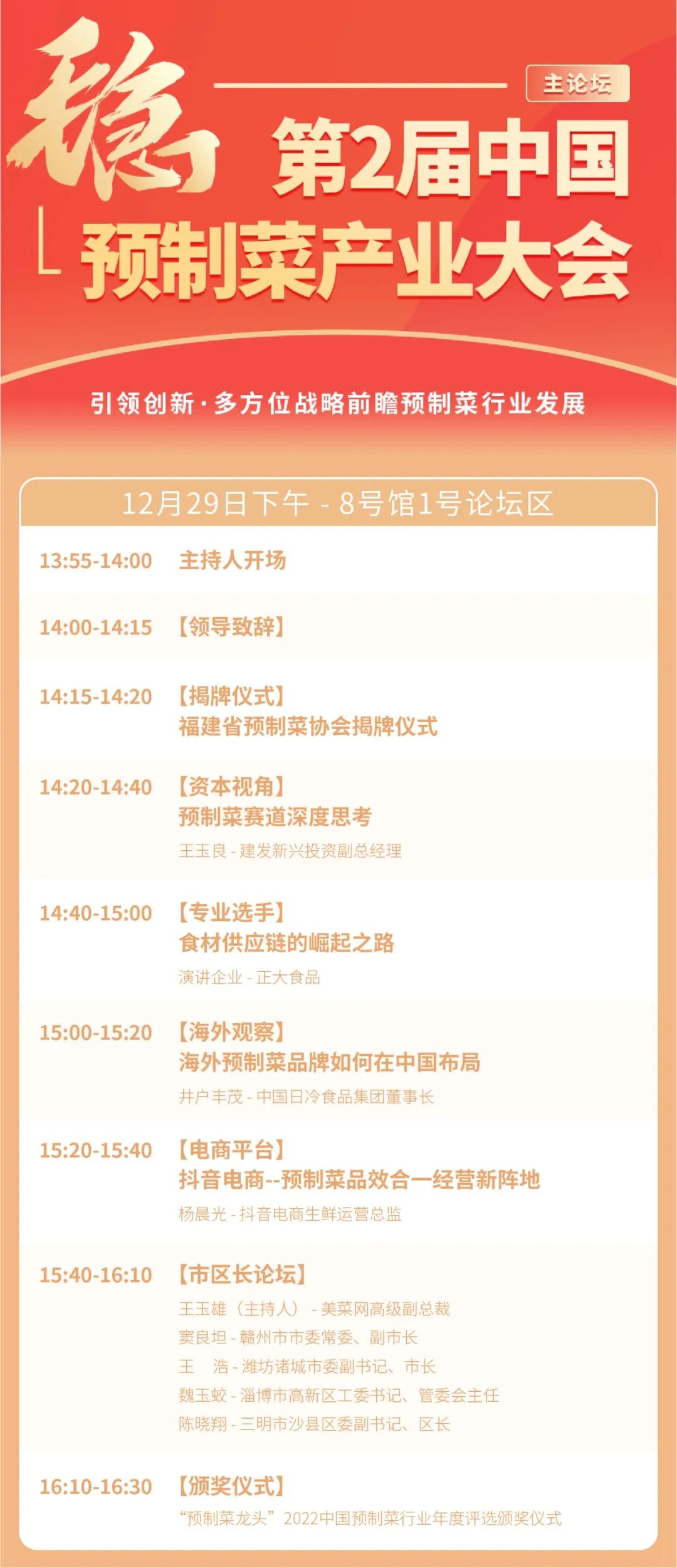 “第2屆中國預(yù)制菜產(chǎn)業(yè)大會”,共設(shè)1+14行業(yè)峰會論壇,分別為第2屆中國預(yù)制菜產(chǎn)業(yè)大會主論壇、2022中國預(yù)制菜產(chǎn)業(yè)投融資論壇、2022中國預(yù)制菜產(chǎn)業(yè)新零售渠道論壇、2022中國菜大師交流高峰論壇、2022中國餐飲行業(yè)預(yù)制菜發(fā)展論壇、2022中國團餐預(yù)制菜產(chǎn)業(yè)發(fā)展論壇、2022中國預(yù)制菜產(chǎn)業(yè)供應(yīng)鏈論壇、2022中國水產(chǎn)品預(yù)制菜產(chǎn)業(yè)大會、2022中國凈菜產(chǎn)業(yè)發(fā)展論壇、2022中國預(yù)制菜冷鏈物流論壇、2022中國預(yù)制菜研發(fā)創(chuàng)新論壇、2022中國預(yù)制菜復(fù)合調(diào)味料論壇、2022中國預(yù)制菜產(chǎn)業(yè)人力資源發(fā)展論壇、2022中國預(yù)制菜包裝設(shè)計論壇、私域運營實戰(zhàn)課。