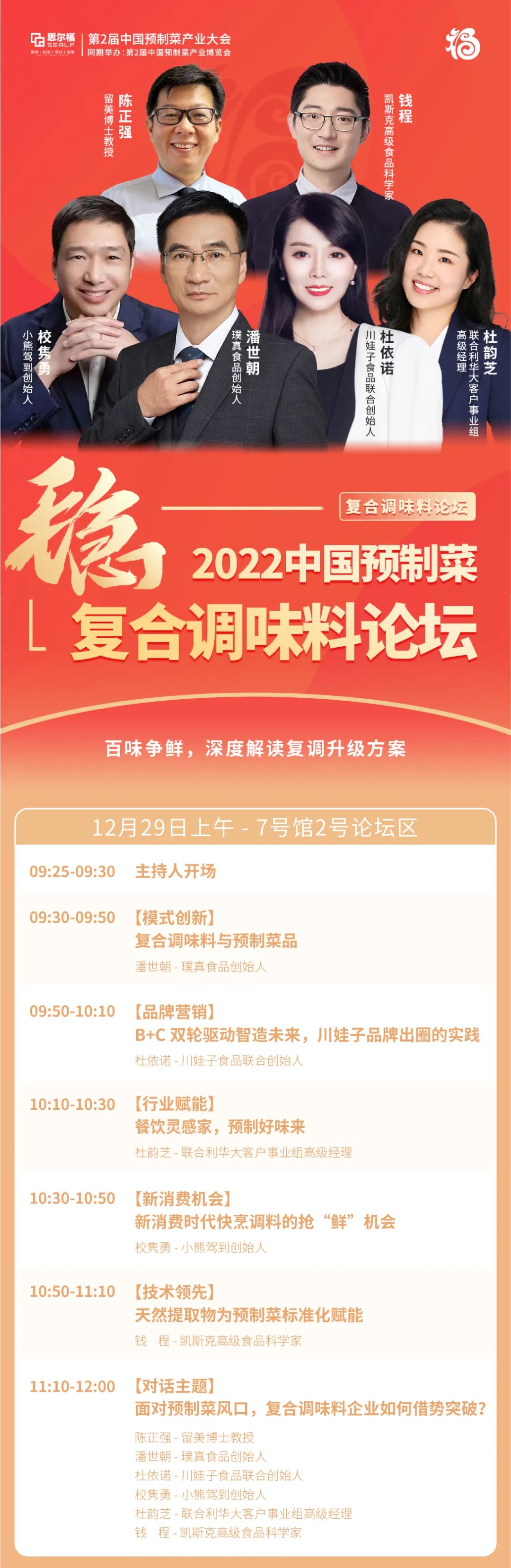 本次論壇我們邀請到了:1、“福建中式復(fù)調(diào)行業(yè)第一,服務(wù)超千家企業(yè)”的璞真食品創(chuàng)始人潘世朝;2、“世界500強新希望控股子公司、中國復(fù)合調(diào)味料TOP品牌”的川娃子食品聯(lián)合創(chuàng)始人杜依諾;3、“成為世界上最大的日用消費品公司之一”的聯(lián)合利華大客戶事業(yè)組高級經(jīng)理杜韻芝;4、“年增長超300%,布局線下終端5000+”的新式復(fù)調(diào)企業(yè)小熊駕到創(chuàng)始人校雋勇;6、“世界上率先量產(chǎn)迷迭香提取物用作抗氧化劑,擁有60多年技術(shù)經(jīng)驗”的凱斯克高級食品科學家錢程;7、留美博士教授陳正強。