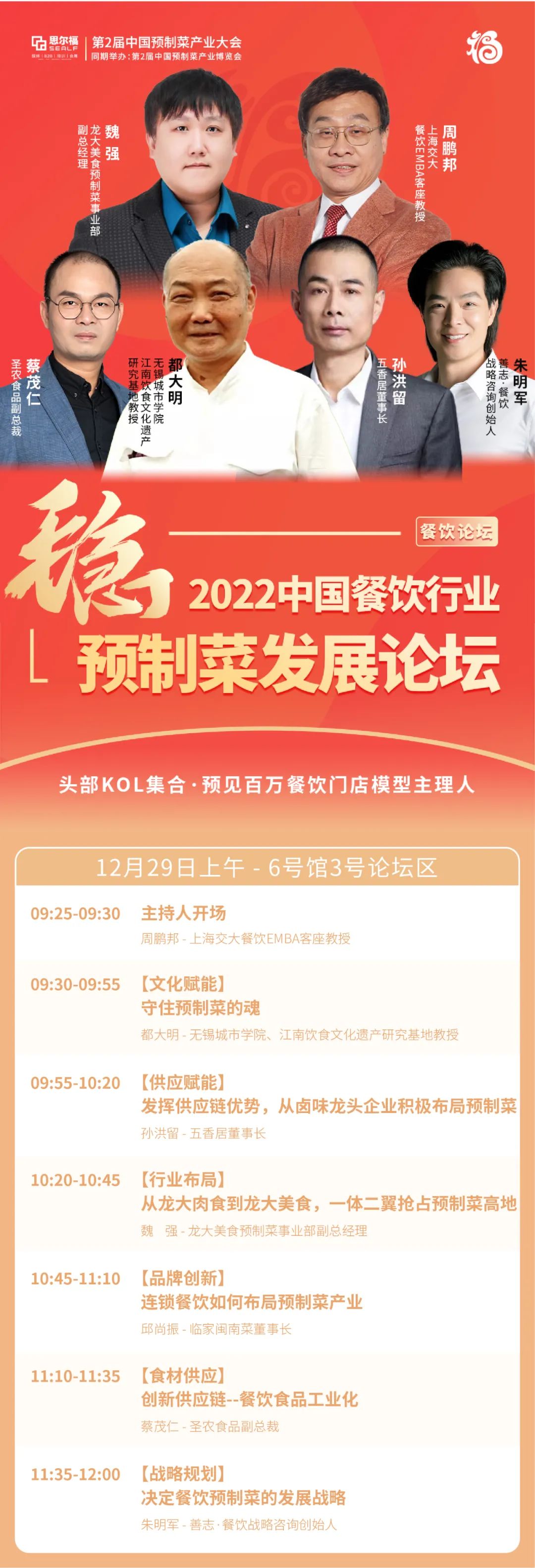 本次論壇我們邀請到了:1、無錫城市學院、江南飲食文化遺產(chǎn)研究基地教授都大明;2、“建有10萬級凈化食品生產(chǎn)車間,規(guī)劃年產(chǎn)值30億元,加盟連鎖門店近500家”的五香居董事長孫洪留;3、“中國民營企業(yè)500強,中國制造業(yè)民營企業(yè)500強”的龍大美食預(yù)制菜事業(yè)部副總經(jīng)理魏強;4、“經(jīng)營面積超 40000 平方米,直營門店19 家”的臨家閩南菜董事長邱尚振;5、“擁有10座食品加工廠、年設(shè)計產(chǎn)能超44萬噸、凍庫容量倉儲能力5.9萬噸、8大系列千余種產(chǎn)品”的圣農(nóng)食品副總裁蔡茂仁;6、“成功打造了全國多個連鎖餐飲品牌,累計服務(wù)門店超過100000家,自創(chuàng)自營品牌苗小壇發(fā)展全國80多個城市600多家門店 ”的善志·餐飲戰(zhàn)略咨詢創(chuàng)始人朱明軍。