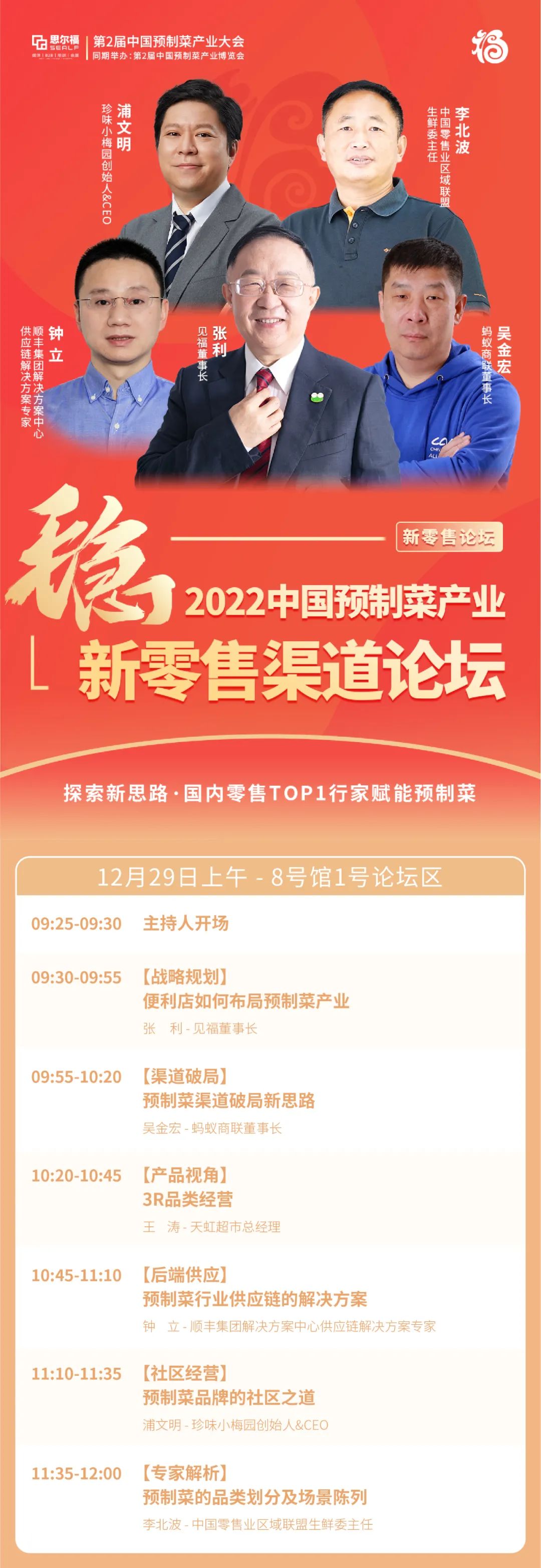 本次論壇我們邀請到了:1、“全國便利店10強,擁有近3000家門店”的見福董事長張利;2、“在全國29個省市區(qū)擁有100家成員企業(yè),共同經(jīng)營著9000多家門店,年營業(yè)額合計近1000億元”的螞蟻商聯(lián)董事長吳金宏;3、“在全國建立眾多生鮮基地,開拓了三十多個國家的直采渠道,引進全球好貨”的天虹超市總經(jīng)理王濤;4、“中國冷鏈物流百強企業(yè),中國冷庫行業(yè)百強企業(yè)”的順豐集團解決方案中心供應(yīng)鏈解決方案專家鐘立。5、“產(chǎn)品研發(fā)超100+,覆蓋5000家商超、2000個社區(qū)網(wǎng)店”的珍味小梅園創(chuàng)始人&CEO浦文明;6、中國零售業(yè)區(qū)域聯(lián)盟生鮮委主任李北波。