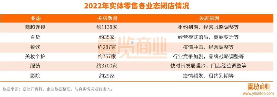關(guān)閉的門店,從業(yè)態(tài)來(lái)看,商超1138家、百貨35家、餐飲287家、美妝個(gè)護(hù)757家、服飾4723家、影院29家等等。