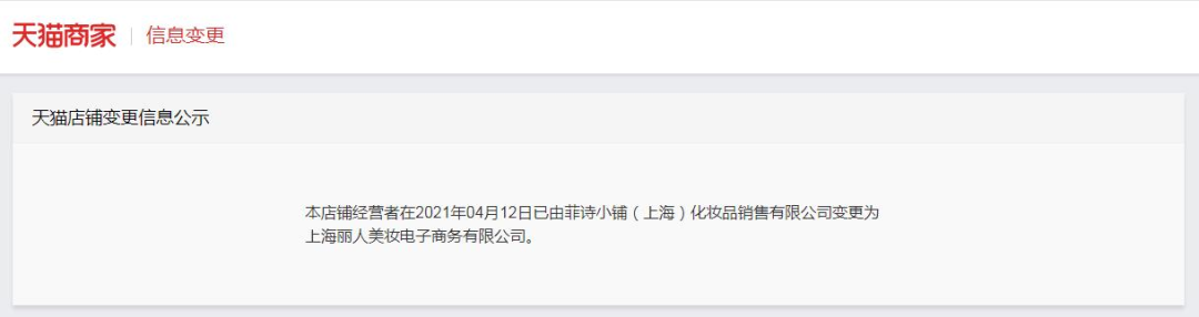值得關(guān)注的是,菲詩(shī)小鋪天貓旗艦店的經(jīng)營(yíng)者已在2021年4月12日由菲詩(shī)小鋪上海公司變更為上海麗人美妝電子商務(wù)有限公司,后者為美妝代運(yùn)營(yíng)企業(yè)麗人麗妝旗下100%控股子公司。