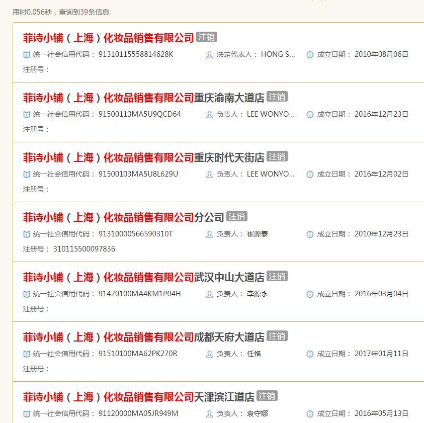 國(guó)家企業(yè)信用信息公示系統(tǒng)顯示,菲詩(shī)小鋪(上海)化妝品銷(xiāo)售有限公司(下稱:菲詩(shī)小鋪上海公司)成立于2010年8月,法定代表人為HONG SUNG HA,注冊(cè)資本500萬(wàn)美元(約合人民幣3500萬(wàn)元),由LG生活健康股份有限公司全資持股。但近日,該公司因“公司合并或分立”而已被注銷(xiāo)。