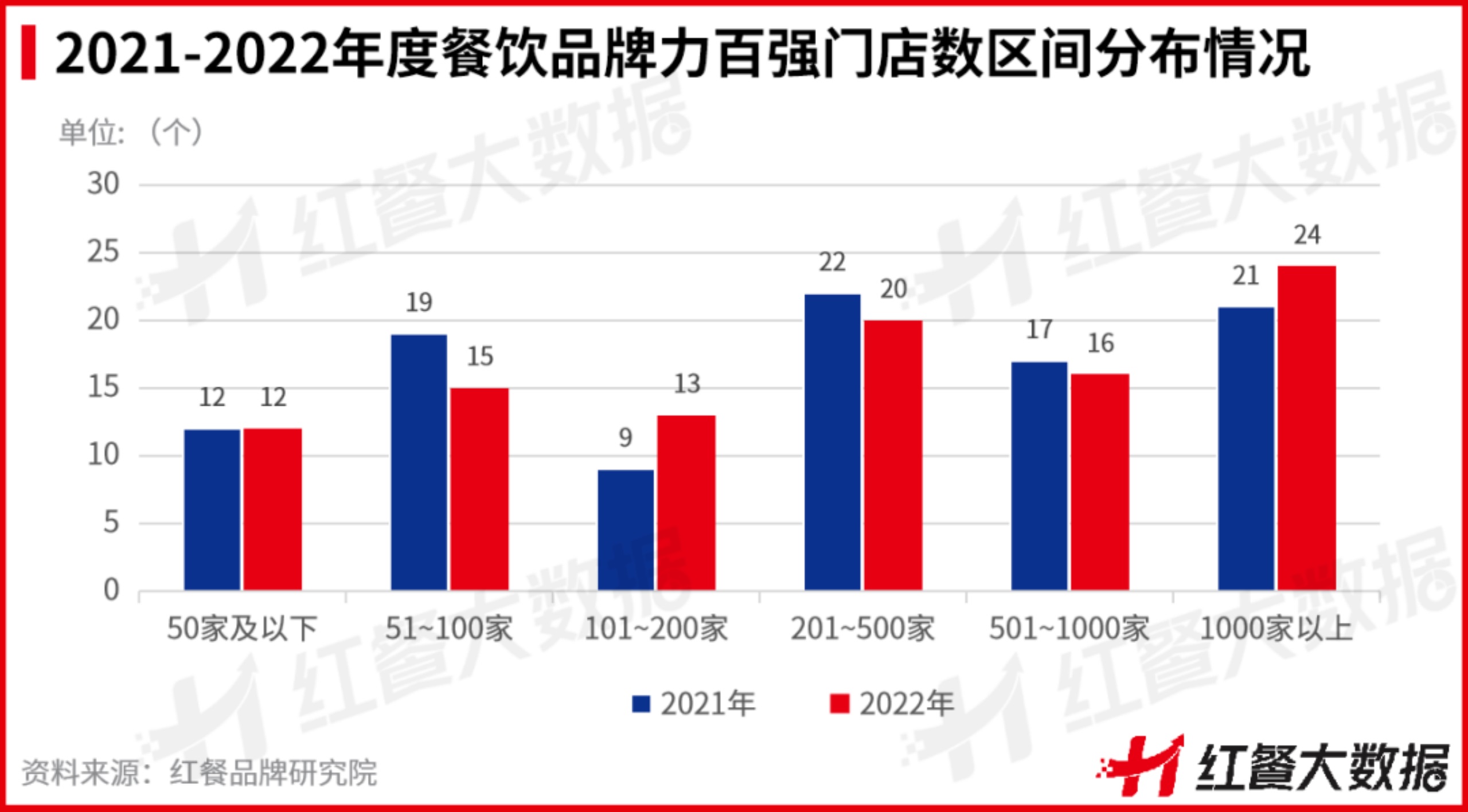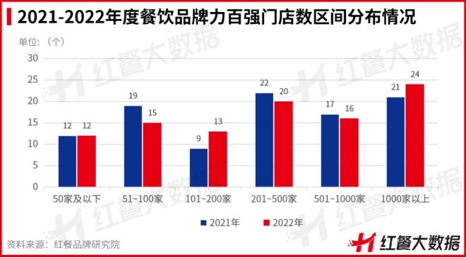 從門店數(shù)規(guī)模上看,門店數(shù)在1000家以上的上榜品牌共計24個,門店數(shù)集中在201~500家的上榜品牌數(shù)達到了20個。