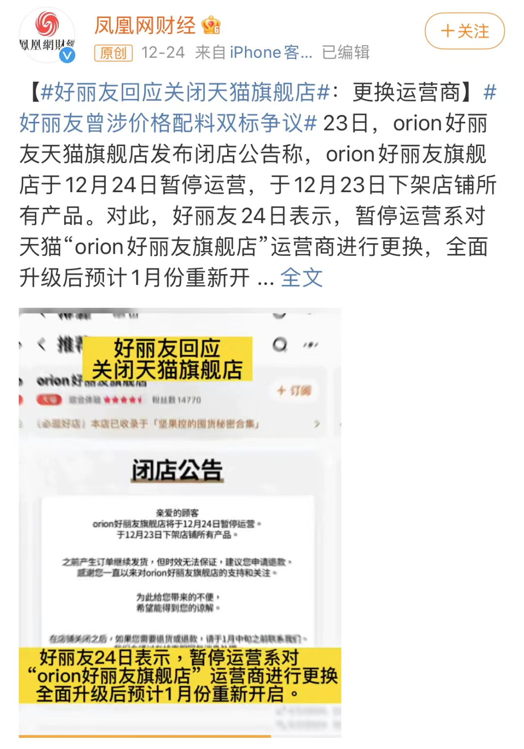 雙十二期間還在積極營銷搞活動的好麗友,突然在12月24日宣布天貓旗艦店閉店。并宣布:在此之前生產訂單繼續(xù)發(fā)貨,但時效無法保證,建議消費者退款;如有退款需求,請于1月中旬之前聯(lián)系客服。