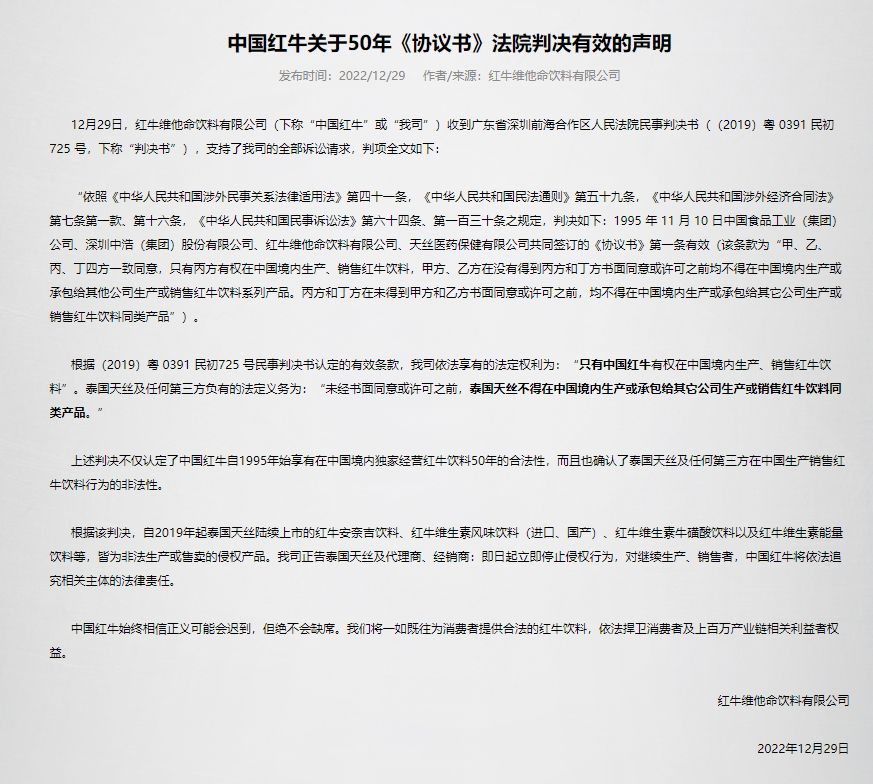 根據(jù)2022年12月29日深圳前海合作區(qū)法院披露的“ (2019)粵 0391民初725號(hào)”判決書(shū)(下稱(chēng)“725號(hào)判決書(shū)”),協(xié)議書(shū)中第一條載明,甲方(中食公司)、 乙方(中浩公司)、丙方(中泰紅牛維他命飲料有限公司或經(jīng)政府批準(zhǔn)的其它名稱(chēng)公司)和丁方(天絲公司)一致同意,只有丙方有權(quán)在中國(guó)境內(nèi)生產(chǎn)、銷(xiāo)售紅牛飲料。甲方、乙方?jīng)]有得到丙方和丁方書(shū)面同意或許可前,不得在中國(guó)境內(nèi)生產(chǎn)或承包給其他公司生產(chǎn)或銷(xiāo)售紅牛飲料系列產(chǎn)品。