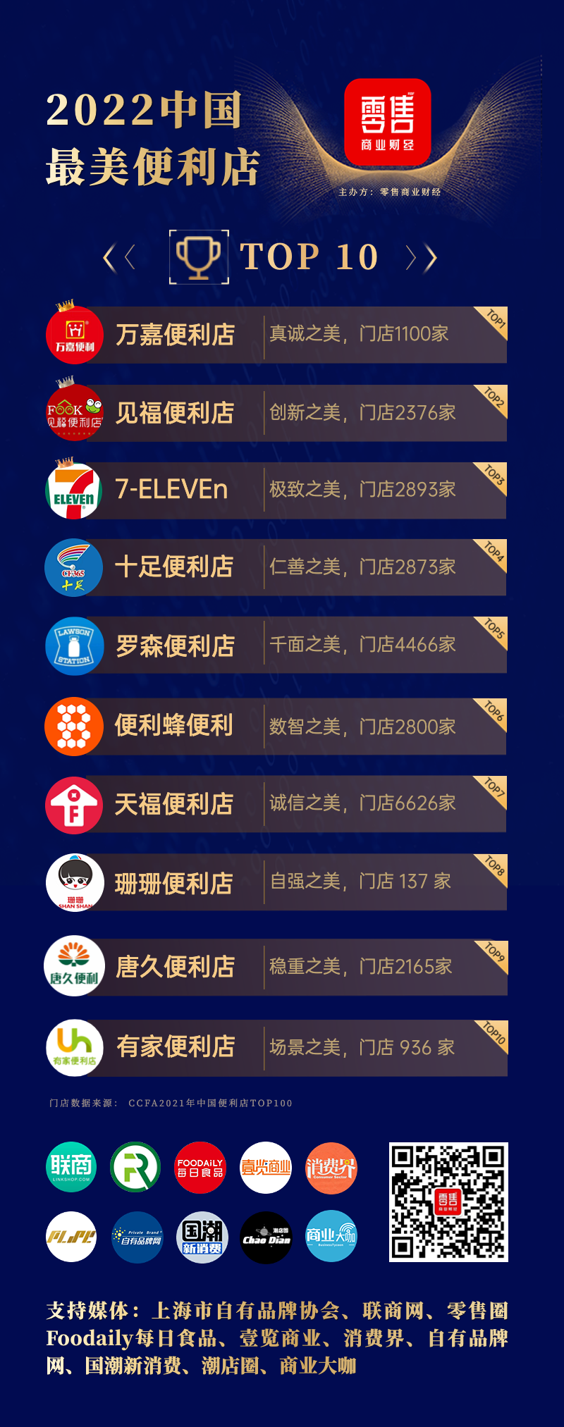 「零售商業(yè)財(cái)經(jīng)」長(zhǎng)期關(guān)注中國(guó)便利店行業(yè)的發(fā)展,綜合考量企業(yè)實(shí)力、品牌榮譽(yù)、消費(fèi)者口碑、企業(yè)在行業(yè)內(nèi)排名,以及12月13日至12月31日網(wǎng)絡(luò)票選結(jié)果后,最終10家便利店品牌脫穎而出、入選“2022中國(guó)最美便利店Top10”榜單。