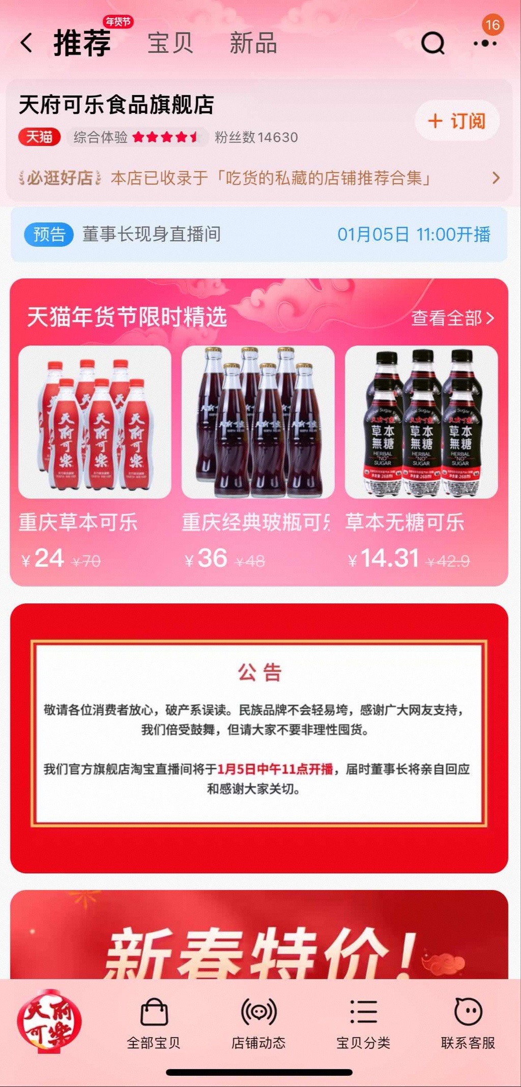 此外,公司董事長(zhǎng)也將在1月5日上午11點(diǎn),到天府可樂(lè)的淘寶直播間開(kāi)播,親自回應(yīng)消費(fèi)者關(guān)切。