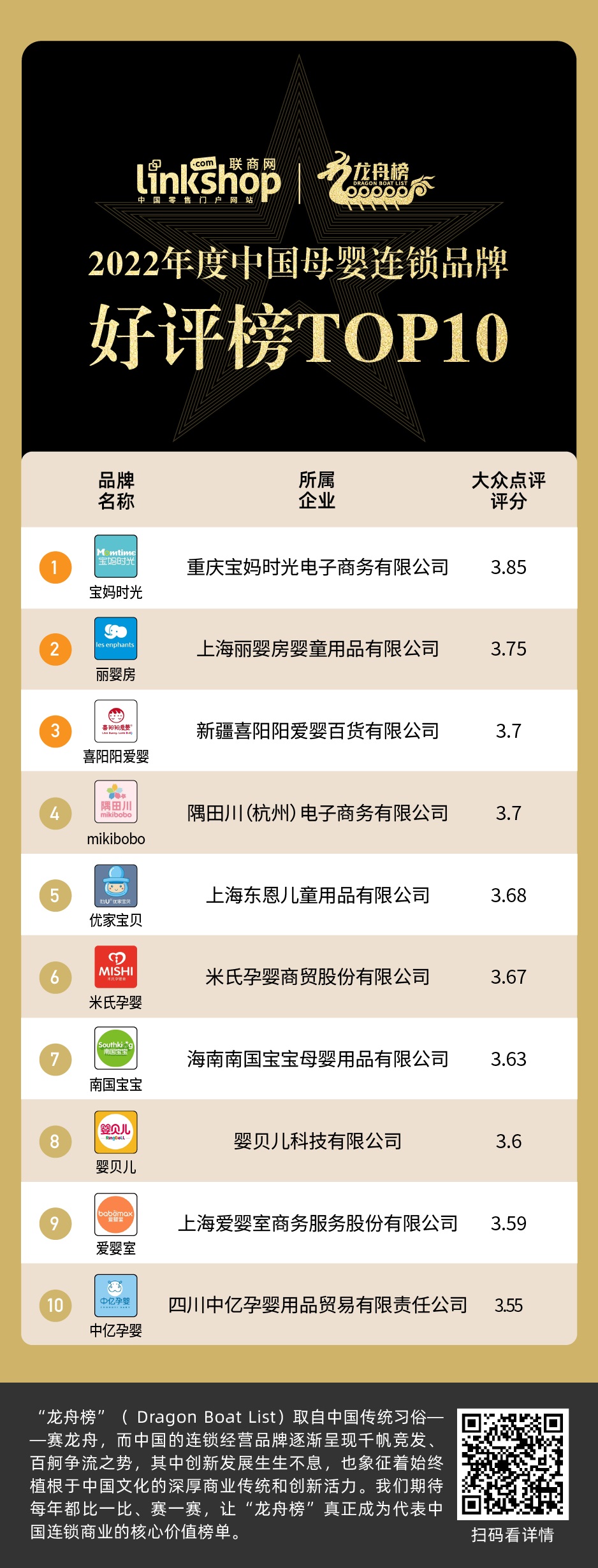 為此,《聯(lián)商網(wǎng)》根據(jù)大眾點(diǎn)評(píng)評(píng)分,推出了“2022年度母嬰用品連鎖品牌好評(píng)榜TOP10”榜單。整體來看,10家母嬰用品連鎖品牌的大眾點(diǎn)評(píng)得分相差不大,最高分為3.85,評(píng)分低為3.55。