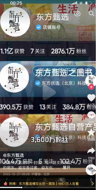 回顧東方甄選最近發(fā)表的開播一周年系列相關(guān)視頻,東方甄選從2021年12月28日首播至今,建立了從1到6的賬號矩陣,所有賬號粉絲總量突破3600萬。東方甄選已經(jīng)連續(xù)數(shù)月霸榜抖音帶貨冠軍,帶貨產(chǎn)品主要覆蓋農(nóng)產(chǎn)品、食品、圖書和生活用品四個品類。目前已推出52款自營產(chǎn)品,所有商品總銷量達1825萬單。