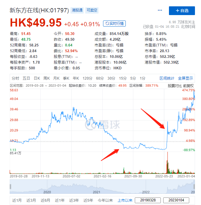 截至1月4日收盤,新東方在線(HK:017971)當(dāng)日漲幅0.91%,股價為49.95港元每股。