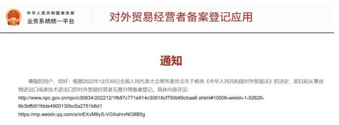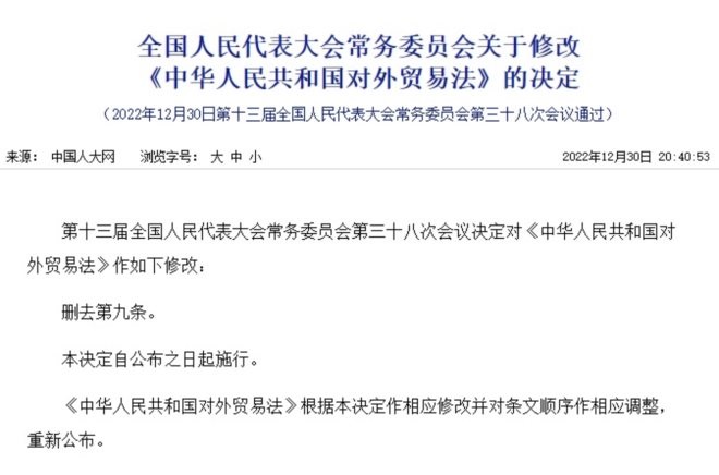 2022年12月30日,中國人大網(wǎng)發(fā)布“全國人民代表大會常務委員會關(guān)于修改《中華人民共和國對外貿(mào)易法》的決定”。