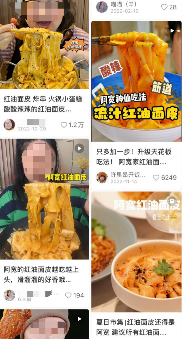 如今,主打“四川特色”“非油炸”“寬面皮”等特色的紅油面皮已成功打響品牌知名度。在小紅書(shū)等內(nèi)容平臺(tái)搜索“紅油面皮”等關(guān)鍵詞不難發(fā)現(xiàn),內(nèi)容基本上都為阿寬品牌。可見(jiàn),白家阿寬已成功將“紅油面皮”與“阿寬”品牌做深度綁定。