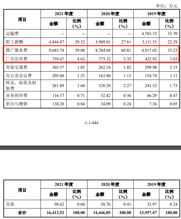 事實(shí)上,當(dāng)我們具體來(lái)看費(fèi)用各項(xiàng)占比,就可以知道其毛利率不斷下滑的根本原因,同時(shí)也是網(wǎng)紅品牌的老通病——營(yíng)銷費(fèi)用居高不下。