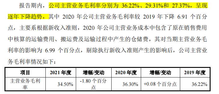 其招股書(shū)顯示,在剔除執(zhí)行新收入準(zhǔn)則產(chǎn)生的影響后,2019年至2021年公司主營(yíng)業(yè)務(wù)毛利率分別為36.22%、36.30%和34.50%,呈現(xiàn)逐年下降趨勢(shì)。其中,2021年主營(yíng)業(yè)務(wù)毛利率較上一年下降1.94個(gè)百分點(diǎn),2020年公司主營(yíng)業(yè)務(wù)毛利率前上一年下降6.91個(gè)百分點(diǎn)。