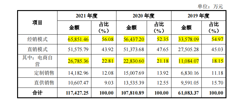 白家阿寬最新披露的招股書(shū)顯示,從2019年到2021年,其電商自營(yíng)的營(yíng)收占比分別為18.15%、21.18%、22.81%,并且比例呈逐年上升趨勢(shì)。