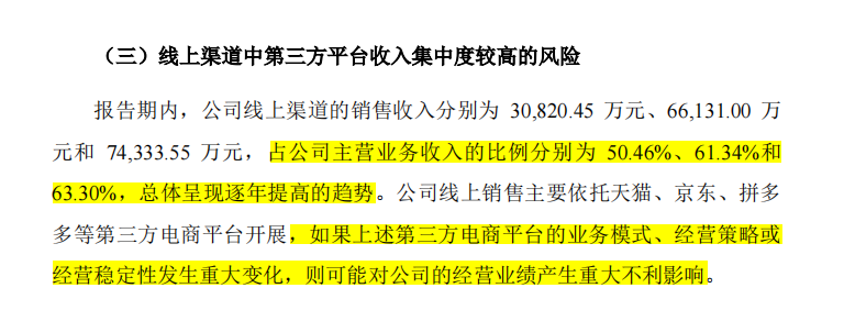 連白家阿寬自己都在招股書(shū)中坦言,過(guò)高的依賴線上渠道,是一項(xiàng)重大的風(fēng)險(xiǎn)點(diǎn)。