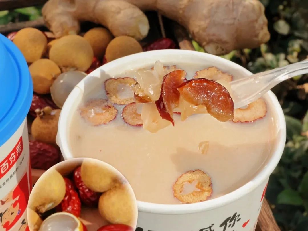 茶百道、阿嬤手作則用姜搭配灰棗等元素,分別上新“姜汁桂圓紅棗”系列和“姜棗水牛乳”。