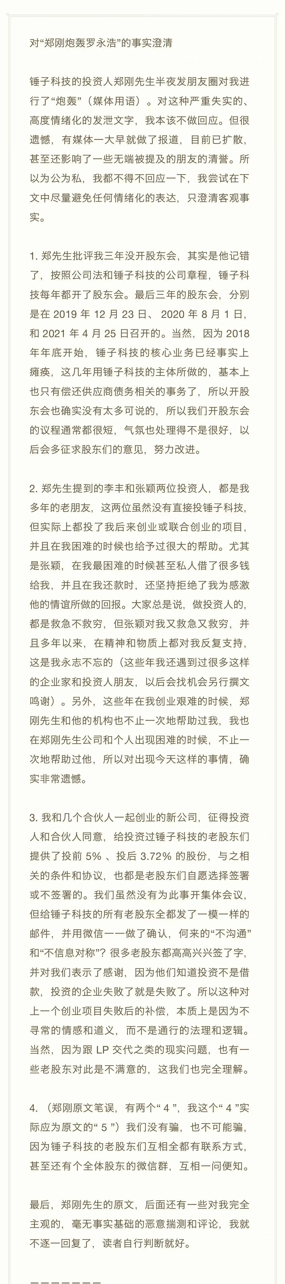 羅永浩公開發(fā)文說(shuō),這些年在我創(chuàng)業(yè)艱難的時(shí)候,鄭剛先生和他的機(jī)構(gòu)也不止一次地幫助過(guò)我,我也在鄭剛先生公司和個(gè)人出現(xiàn)困難的時(shí)候,不止一次地幫助過(guò)他,所以對(duì)出現(xiàn)今天這樣的事情,非常遺憾。