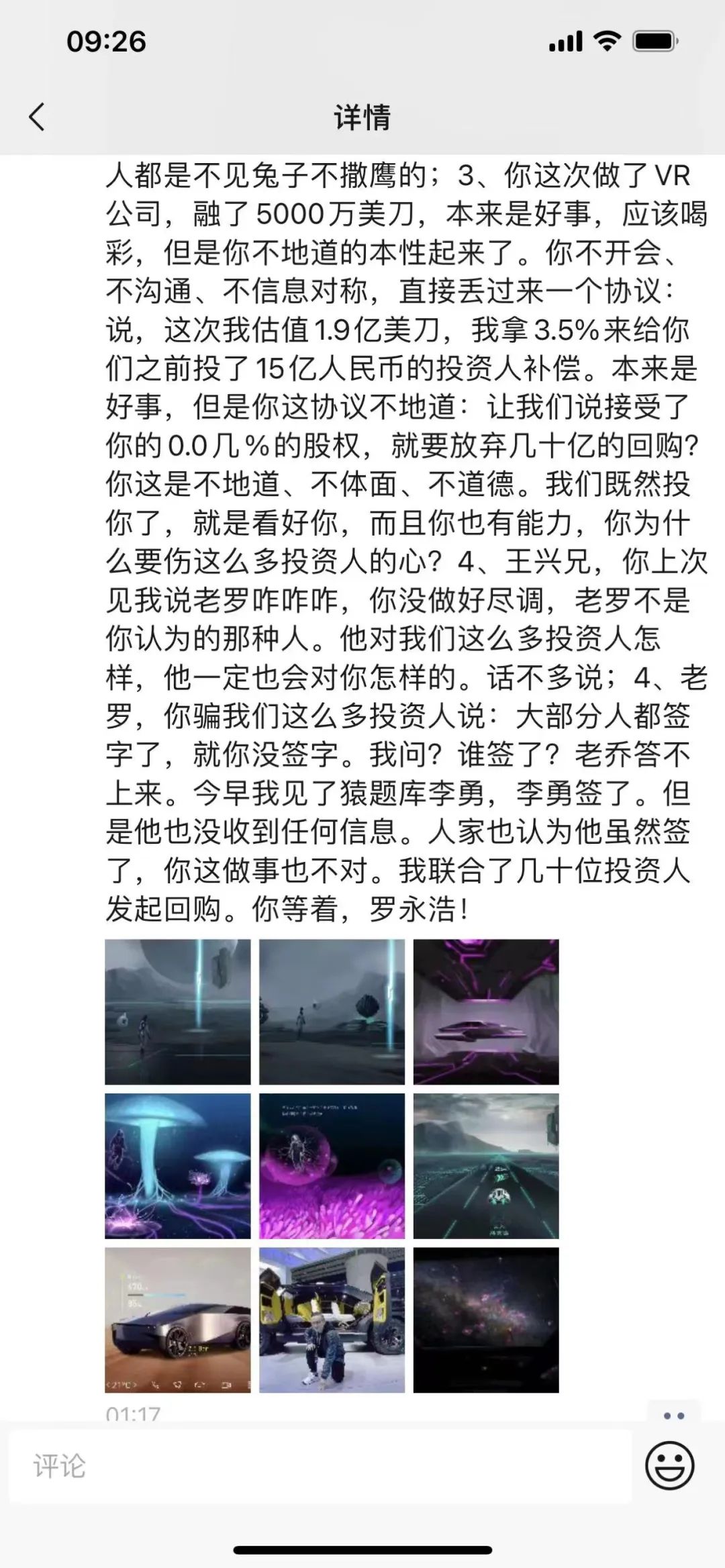 鄭剛在朋友圈的文字稱,“你這次做了VR公司,融了5000萬(wàn)美刀,本來(lái)是好事,應(yīng)該喝彩,但是你不地道的本性起來(lái)了。你不開會(huì)、不溝通、不信息對(duì)稱,直接丟過(guò)來(lái)一個(gè)協(xié)議:說(shuō),這次我估值1.9億美刀,我拿3.5%來(lái)給你們之前投了15億人民幣的投資人補(bǔ)償。本來(lái)是好事,但是你這協(xié)議不地道:讓我們說(shuō)接受了你的0.0幾%的股權(quán),就要放棄幾十億的回購(gòu)?”