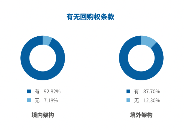 漢坤的數(shù)據(jù)亦顯示,采用境外架構(gòu)的VC/PE項(xiàng)目中,大多約定僅由公司承擔(dān)回購(gòu)義務(wù),而采用境內(nèi)架構(gòu)的VC/PE項(xiàng)目中,大多約定由創(chuàng)始股東和公司承擔(dān)連帶的回購(gòu)義務(wù),還有少數(shù)項(xiàng)目約定僅由創(chuàng)始股東承擔(dān)回購(gòu)義務(wù)。另外值得注意的是,在境外架構(gòu)的VC/PE項(xiàng)目中,約定僅由公司承擔(dān)回購(gòu)義務(wù)的項(xiàng)目也有所減少。