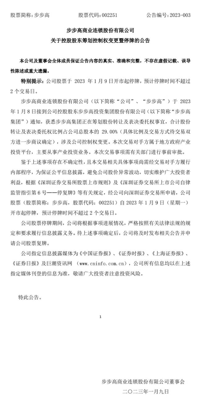 1月9日,深交所公告顯示,步步高商業(yè)連鎖股份有限公司擬籌劃控制權(quán)變更事項,公司股票于2023年1月9日開市起臨時停牌,待公司通過指定媒體披露相關(guān)公告后復牌。