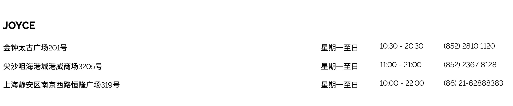 根據JOYCE官網顯示:目前JOYCE僅有3家門店,分別位于上海恒隆廣場、香港金鐘太古廣場以及香港海港城港威廣場。