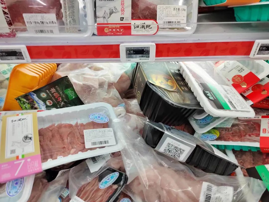 我們站在一旁,略顯生疏地使用掃碼工具對準(zhǔn)一盒排骨,16.95元,6折左右。老太太也湊過來看手機(jī)屏幕上的結(jié)果,而后似乎是徹底對豬肉失望了,推著灰色的小推車,轉(zhuǎn)身去了賣牛肉和雞肉的冷藏柜。