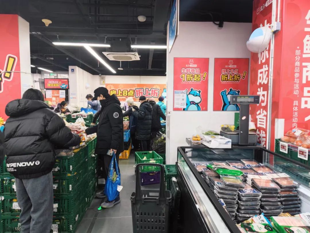 2023年1月9日下午4點(diǎn)30分,我們抵達(dá)了位于太陽宮地鐵站附近的盒馬奧特萊斯。門店面積很小,遠(yuǎn)小于盒馬生鮮,也比不上盒馬mini寬敞,以生鮮商品為主,有少量牛奶、面包、冷凍食品和休閑零食。