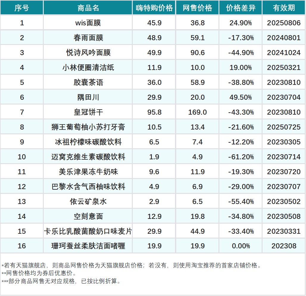 我們統(tǒng)計(jì)了16款商品的信息,包括其在嗨特購的價(jià)格和網(wǎng)售價(jià)格,以及產(chǎn)品有效期。其中,3款商品價(jià)格高于網(wǎng)售途徑,12款商品低于網(wǎng)售途徑,還有一款與天貓官方旗艦店售價(jià)相同。