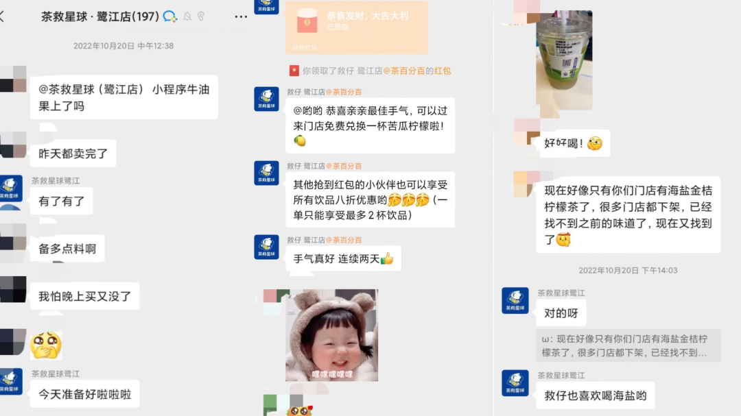 和廖瑩一樣的,還有「茶救星球」加盟商張維。面對周邊茶飲同行的激烈競爭和線上訂單利潤低的現(xiàn)狀,張維主動向總部申請設(shè)置微信小程序的抽獎活動,并通過“搶紅包”贏兌換機(jī)會的方式與消費(fèi)者在私域微信群積極互動,促進(jìn)消費(fèi)者到店消費(fèi)。