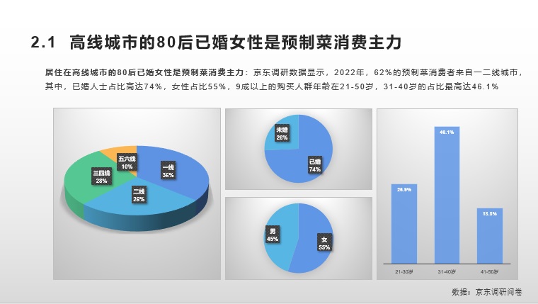 數(shù)據(jù)顯示,京東超市的預制菜用戶年復合增速超過50%。其中,高線城市用戶占比67%,家庭用戶占比76%,成增長主力。從購買人群來看,女性占比55%、已婚占比74%, 21歲-30歲的年輕化及單身人群增長趨勢明顯。高線城市已婚家庭女性是預制菜消費主力。