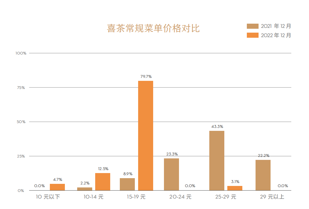 而在爆款新品背后,是喜茶產(chǎn)品價(jià)格帶與研發(fā)方向的全面遷移。喜茶產(chǎn)品開始注重性價(jià)比,去年喜茶的主力新品分別是多肉桃李、多肉車?yán)遢⒍嗳庑舆\(yùn)桃、酷黑提莓、糯糯系列等,新品幾乎無一例外地選擇了15到19元價(jià)格帶。喜茶數(shù)據(jù)顯示,這一主力價(jià)格帶截至去年12月的產(chǎn)品占比還是8.9%,今年12月已經(jīng)占到79.7%。