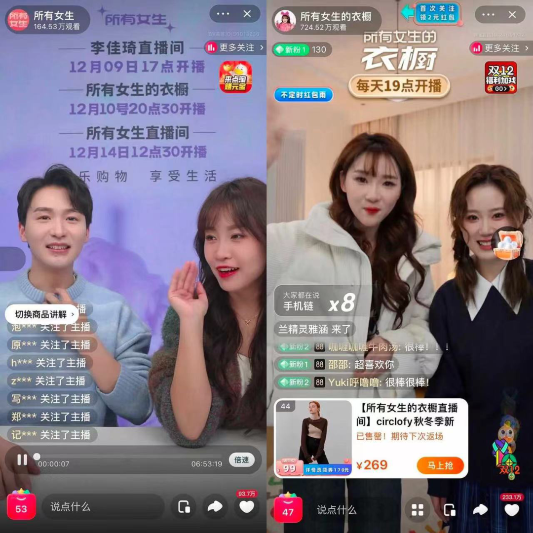 12月10日,繼“所有女生”后李佳琦又推出了一個新號:“所有女生的衣櫥”,正式開播的第二天,李佳琦便與該直播間進(jìn)行連麥,為其引流。擴(kuò)展選品寬度之外,矩陣式直播間部署,也是在弱化“李佳琦”的個人屬性。