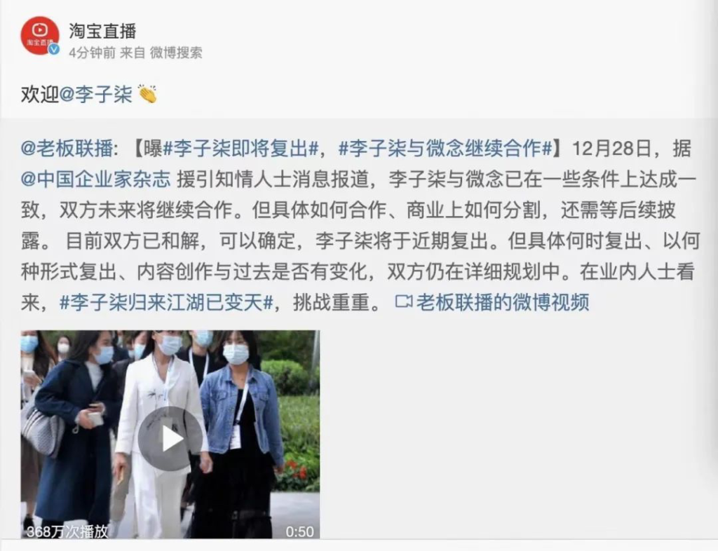 停更500多天之后,李子柒終于要?dú)⒒貋砹恕?022年12月底,李子柒與杭州微念公司正式達(dá)成和解。當(dāng)日,淘寶直播官方賬號轉(zhuǎn)發(fā)了相關(guān)新聞,并@李子柒說:歡迎。這不僅佐證了上述猜測,也透露了李子柒未來可能入駐淘寶直播。
