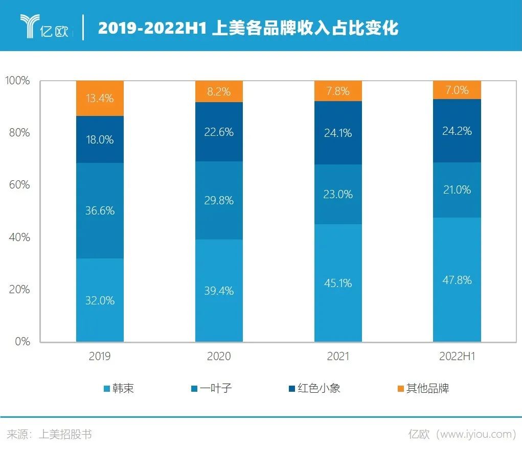 2019年,韓束、一葉子、紅色小象三大品牌尚屬均衡發(fā)展,對(duì)收入貢獻(xiàn)分別為32%、36.6%和18%。但到了2022年上半年,韓束的營(yíng)收貢獻(xiàn)占比上漲到47.8%,一葉子的營(yíng)收占比卻已降到了21%,甚至低于紅色小象的24.2%。