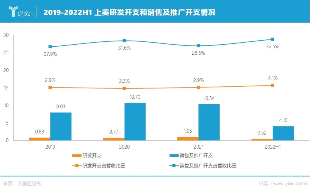 但從數(shù)據(jù)上看,上美歷年來(lái)的研發(fā)投入都不高。2019-2021年及2022年上半年,上美研發(fā)開(kāi)支分別為8290萬(wàn)元、7740萬(wàn)元、1.05億元及5190萬(wàn)元,分別占收入2.9%、2.3%、2.9%及4.1%。