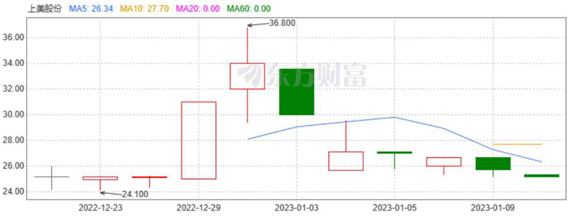 但好景不長(zhǎng),進(jìn)入2023年,上美股價(jià)在短短幾個(gè)交易日內(nèi)就“打回原形”,從2022年12月30日的高點(diǎn)36.8港元/股,一路跌至1月9日最低時(shí)的25.2港元/股。
